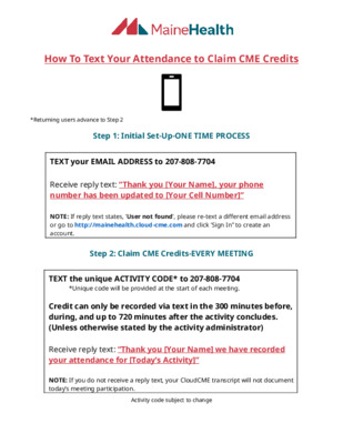 Step 1: Initial Set-Up-ONE TIME PROCESS TEXT your EMAIL ADDRESS to 207-808-7704 Receive reply text: “Thank you [Your Name], your phone number has been updated to [Your Cell Number]” NOTE: If reply text states, ‘User not found’, please re-text a different email address or go to http://mainehealth.cloud-cme.com and click ‘Sign In” to create an account.
